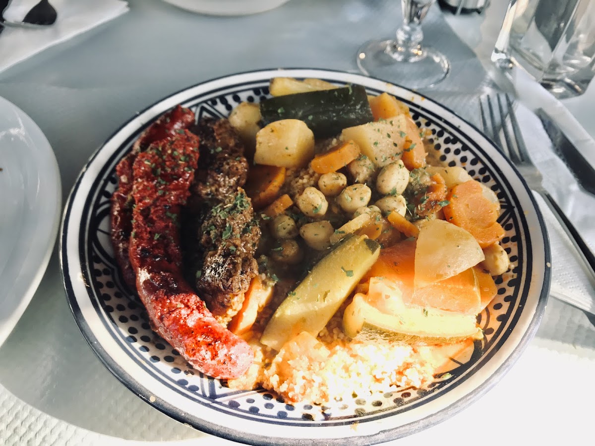 The menu leans into Moroccan specialties alongside broader Mediterranean influences, with dishes like the Couscous Marocain du Jour, Kefta, and Mechouia Merguez offering satisfying, well-spiced options. The presence of salads such as the Salade Norvégienne and Salade Niçoise provides lighter alternatives that still pack regional character—fresh ingredients and familiar Mediterranean touches make these a great choice for those seeking something less rich but still thoughtfully composed.